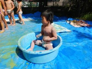 身体中につけて楽しむ子、様子を伺いながら控え目に楽しむ子とそれぞれでしたが手で触って、足で触って、とっても気持ちよさそうな様子でした。(お部屋もなんとか無事でした!)「こんなことやってみない?」と提案すると「いいねー!」ととっても意欲的な年少さん。また、子どもたちの日頃のあそびから発展させて活動を計画していきたいと思っています。「今日、えのぐたのしかったね!」と帰っていく子どもたちの笑顔に合えて私たちもとっても嬉しかったです。