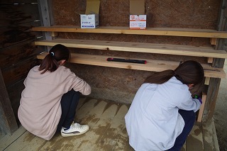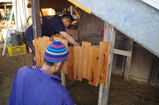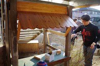 慣れない木工作業ですが、子どもたちのあそびが広がることを考えながら、使い勝手、片付けやすさも考慮して作業をしてくれました。