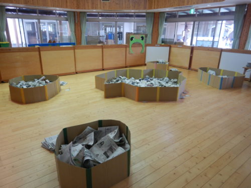 実際につながるーむに子どもたちが入ってくると新聞紙のプールに嬉しそうにかけてきました!プールの中に飛びこんでみたり、広げた新聞紙にパンチしてみたり…。