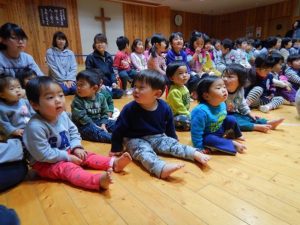 人数が多くなったため、今年からは二回公演。ということで乳児のお友だちも一緒に劇を楽しみました。