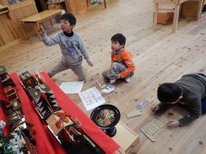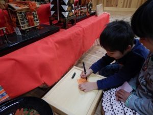 下のお雛様を見に行く中で、「3にんかんじょが ふたりしかいないね~」 「これじゃ2にんかんじょじゃん!!」なんて会話も。また「お雛様みにいって来ていいからね」と声をかける先生に「なんかいも見に行くのたいへんだから、もうしたでやってくるね!」と言ってクレパスと紙を持って出掛けて行く子どもも。