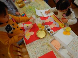 年少さんでは3学期から始めた染紙を使って、作っています。いろいろな表情があってとっても可愛いですね。