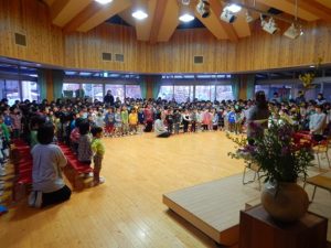 その後は、お誕生日のお友だちが舞台に登り、お誕生日の子の紹介、そしてプレゼント絵本をもらいました。その後は各学年の歌。