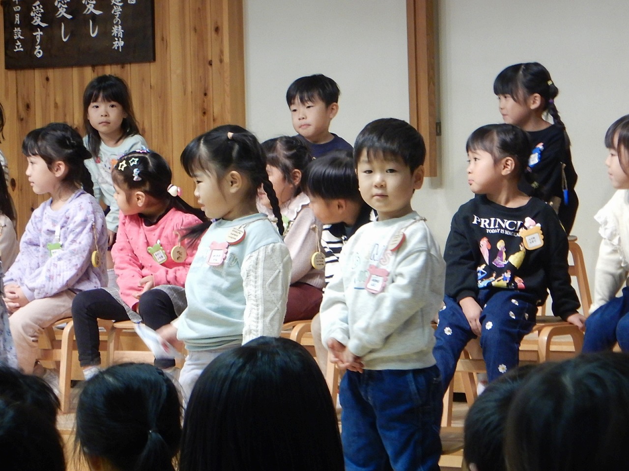 年少さんはお返事をします。年中さんは自分の名前、年長さんは名前と誕生日を発表します。