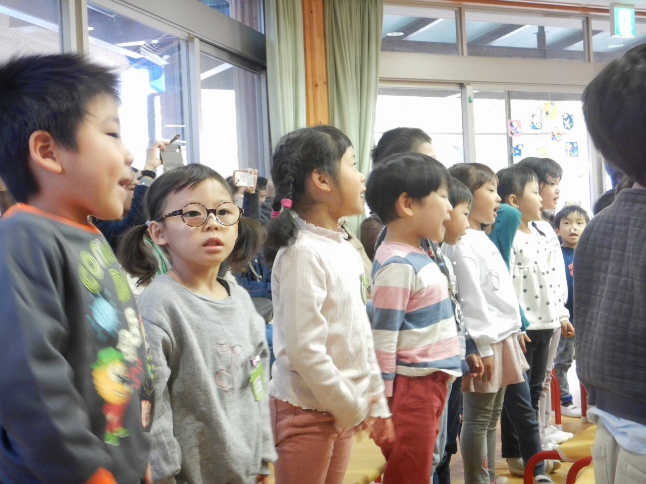 みんなからの歌のプレゼント♪ 年少さんは「おもちゃのチャチャチャ」、年中さんは「きのこ」、年長さんは「森のファミリーレストラン」を歌いました。つながるーむじゅうに子どもたちの素敵な歌声が響きました♪