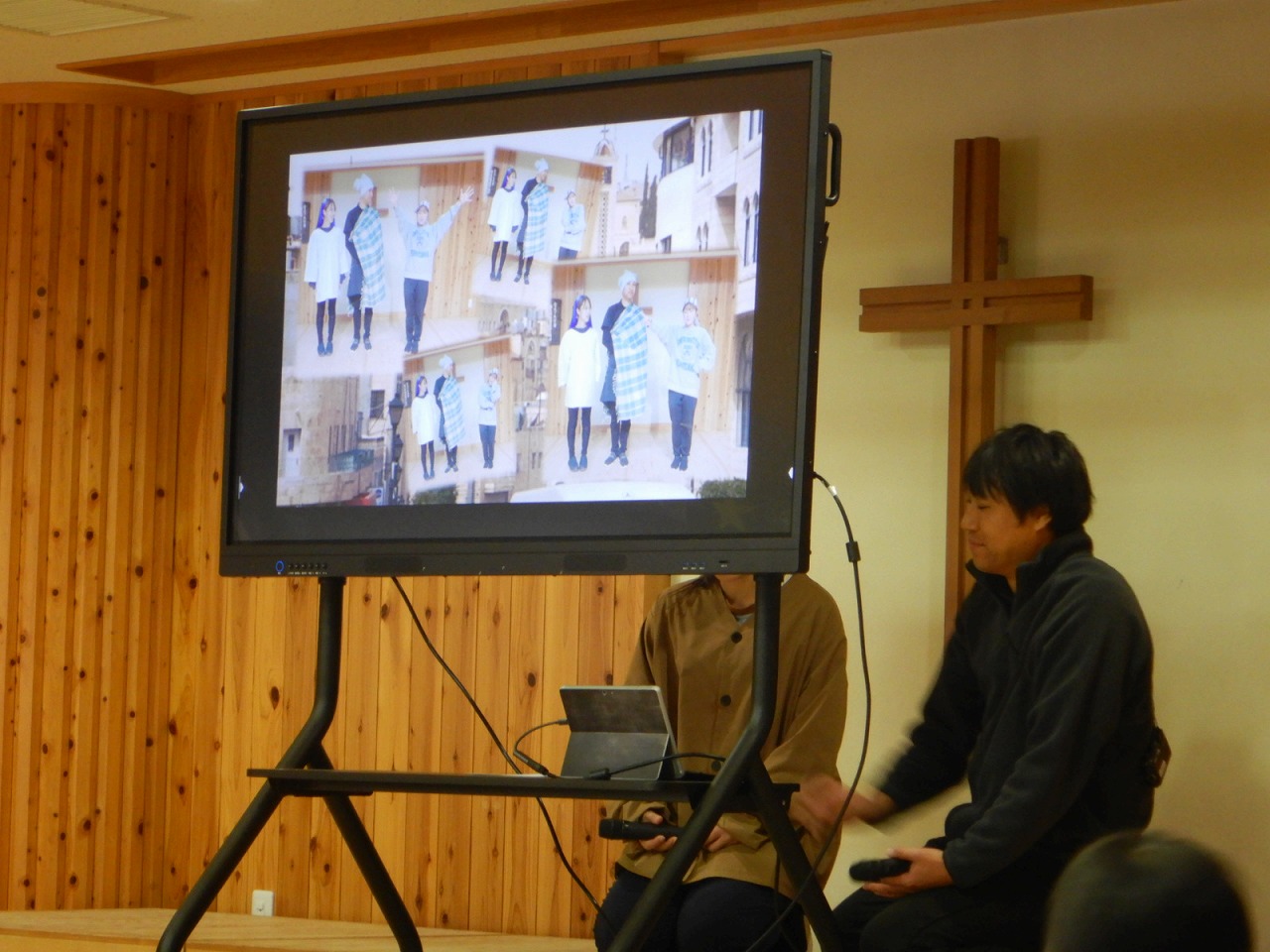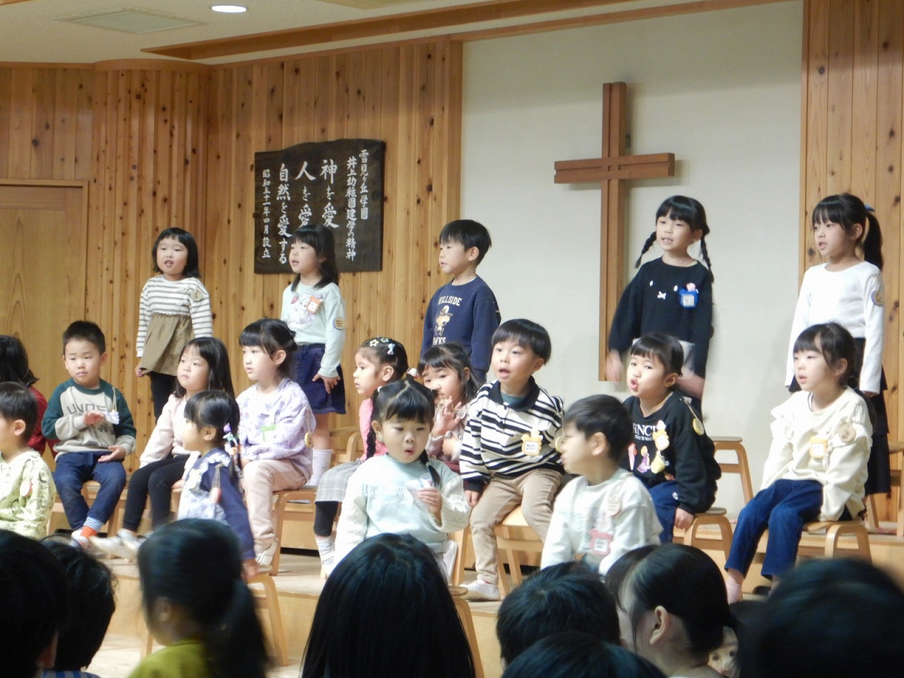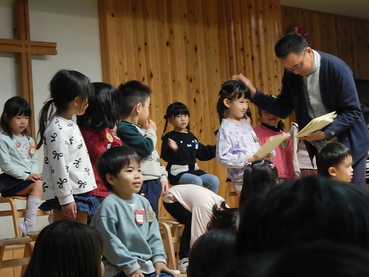 礼拝を終えたら、待ちに待った誕生会!誕生児のお友だちが舞台に上がります。
