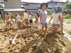 すなってきもち~!!! (年長女の子)といって砂に埋まったり、砂の山から転がったりして楽しんでいました。もう本当に見ていて気持ち良い程あそんでくれる姿。日々(あぁやってよかった)と思えるような姿を沢山見せてくれる子どもたちです。