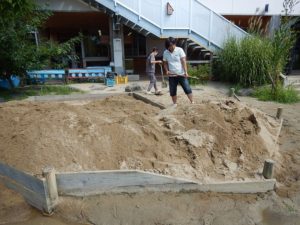 それを大人4人がかりで砂場の中に入れていきます。暑かった…