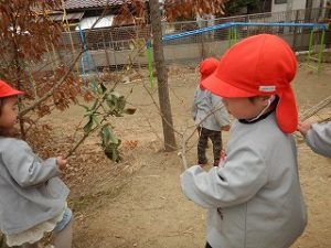 朝の外あそびの時間。せっせと枝をも運ぶ子どもたち。職員の家庭で出た選定した大きな枝を運ぶ子もいれば、園庭に落ちている枝を探して拾ってくる子どもも。