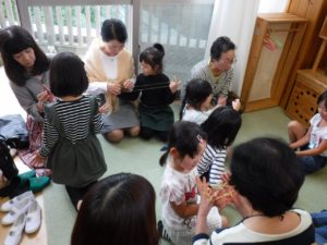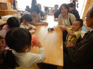 そしてお部屋では年少はふれあいあそび、年中と年長はいつもの幼稚園での部屋あそびを一緒にしたり、おてだまやあやとり、折り紙を教えてもらったりした後にふれあいあそびをして過ごしました。