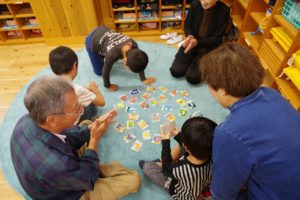 まずはつながるーむで一緒に礼拝をして過ごしました。子どもたちに「おじいちゃんおばあちゃんの名前を知ってる?」と尋ねると、はい!と元気に手を挙げて「じいじとばあば!」と答える子(そうだよね、いつもそう呼んでるもんね)、「○○ばあちゃん!」としっかり名前が言えた子もおり、可愛らしい姿におじいちゃんおばあちゃんからは温かい拍手とつながるーむはみんなの笑顔がいっぱい溢れていました。